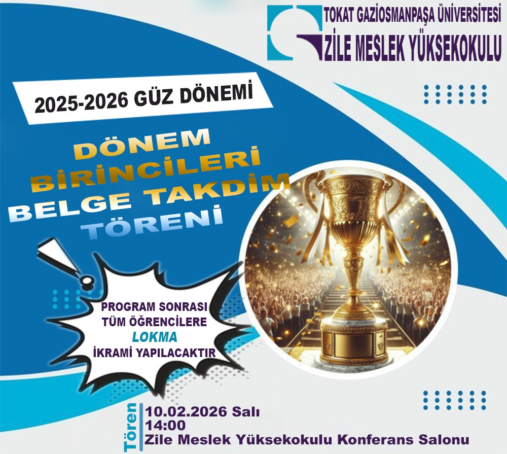 Tokat Gaziosmanpaşa Üniversitesi Zile Meslek Yüksekokulu’nda akademik ve öğrenci başarılarını teşvik etmek amacıyla düzenlenen “Başarı Belgeleri Takdim Töreni”, yoğun katılımla gerçekleştirildi. Programda akademik unvan alan öğretim elemanları ile dönemlerini birincilikle tamamlayan öğrenciler onurlandırıldı.