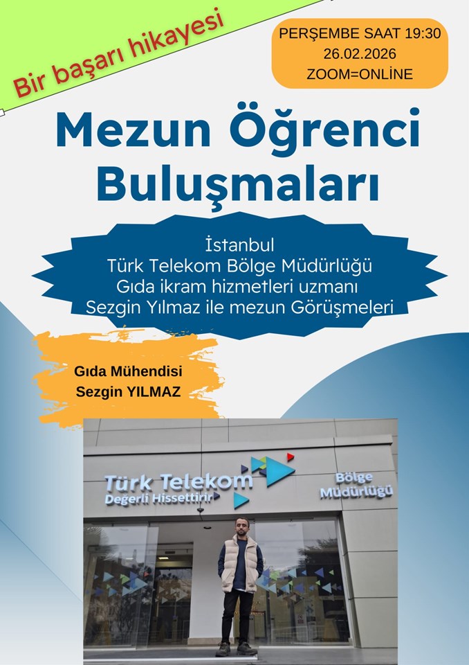 Zile Meslek Yüksekokulu Gıda İşleme Bölümü tarafından düzenlenen çevrim içi öğrenci–mezun buluşması, Bölüm Başkanı Dr. Öğr. Üyesi Şeyda Öztürk’ün moderatörlüğünde gerçekleştirildi. Yaklaşık 18 öğrencinin katıldığı etkinlikte, mezunumuz ve halen Türk Telekom İstanbul Bölge Müdürlüğü’nde Gıda İkram Hizmetleri Uzmanı olarak görev yapan gıda mühendisi konuğumuz, sektörel deneyimlerini öğrencilerle paylaştı.